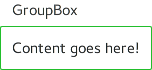 import QtQuick 2.6 import QtQuick.Controls 2.1 GroupBox { id: control title: qsTr("GroupBox") background: Rectangle { y: control.topPadding - control.padding width: parent.width height: parent.height - control.topPadding + control.padding color: "transparent" border.color: "#21be2b" radius: 2 } Label { text: qsTr("Content goes here!") } }