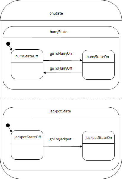 When the state machine enters onState, it first clears the current score variable. The onState state is of the parallel type and has two direct child states: hurryState and jackpotState. They are active as long as their parent, onState, is active. Both hurryState and jackpotState contain two substates that reflect their off and on states. Only one substate of hurryState and one substate of jackpotState can be active at a time. Initially, the off substates are active.