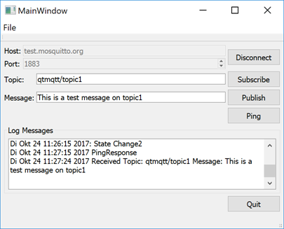 To use the application, you first specify a broker, such as test.mosquitto.org or broker.hivemq.com and the port number 1883, and connect to it. You can then subscribe to a topic and send a message, which you will also receive.