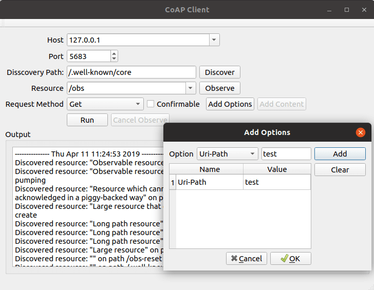If there are observable resources on the server (meaning that they have the resource type obs), we can subscribe to updates on that resource by running an observe request: