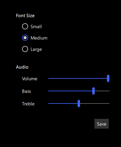 Both attributes can be specified for any window or item, and they automatically propagate to children in the same manner as fonts. In the following example, the window and all three radio buttons appear in the dark theme using a violet accent color: