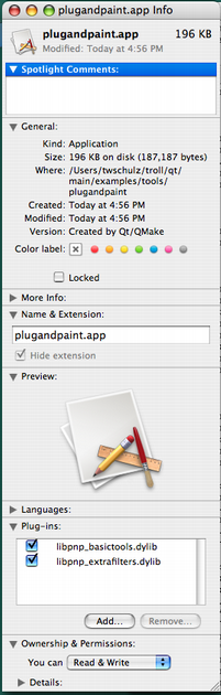 ![]() | The additional code in tools/plugandpaint/mainwindow.cpp also enables us to view the plugins in the Finder, as shown in the image.We can also add plugins extending Qt, for example adding SQL drivers or image formats. We just need to follow the directory structure outlined in plugin documentation, and make sure they are included in the QCoreApplication::libraryPaths(). Let's quickly do this with the image formats, following the procedure outlined earlier. Copy Qt's image format plugins into the bundle: cp -R /path/to/Qt/plugins/imageformats pluginandpaint.app/Contents/plugins Use install_name_tool -change /path/to/Qt/lib/QtGui.framework/Versions/4.0/QtGui @executable_path/../Frameworks/QtGui.framework/Versions/4.0/QtGui plugandpaint.app/Contents/plugins/imageformats/libqjpeg.dylib install_name_tool -change /path/to/Qt/lib/QtCore.framework/Versions/4.0/QtCore @executable_path/../Frameworks/QtCore.framework/Versions/4.0/QtCore plugandpaint.app/Contents/plugins/imageformats/libqjpeg.dylib Update the source code in QDir dir(QCoreApplication::applicationDirPath()); dir.cdUp(); dir.cd("plugins"); QCoreApplication::setLibraryPaths(QStringList(dir.absolutePath())); First, we tell the application to only look for plugins in this directory. In our case, we want the application to look for only those plugins that we distribute with the bundle. If we were part of a bigger Qt installation we could have used QCoreApplication::addLibraryPath() instead. |