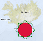 The following snippet shows how to use a MapItemGroup to create a MapCircle, centered at the coordinate (63, -18) with a radius of 100km, filled in red, surrounded by an ondulated green border, both contained in a semitransparent blue circle with a MouseArea that moves the whole group. This group is defined in a separate file named PolygonGroup.qml: