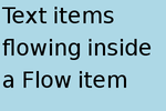 Flow { anchors.fill: parent anchors.margins: 4 spacing: 10 Text { text: "Text"; font.pixelSize: 40 } Text { text: "items"; font.pixelSize: 40 } Text { text: "flowing"; font.pixelSize: 40 } Text { text: "inside"; font.pixelSize: 40 } Text { text: "a"; font.pixelSize: 40 } Text { text: "Flow"; font.pixelSize: 40 } Text { text: "item"; font.pixelSize: 40 } }