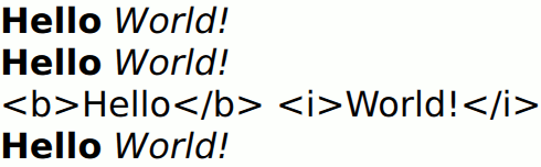 Column { TextEdit { font.pointSize: 24 textFormat: TextEdit.AutoText text: "<b>Hello</b> <i>World!</i>" } TextEdit { font.pointSize: 24 textFormat: TextEdit.RichText text: "<b>Hello</b> <i>World!</i>" } TextEdit { font.pointSize: 24 textFormat: TextEdit.PlainText text: "<b>Hello</b> <i>World!</i>" } TextEdit { font.pointSize: 24 textFormat: TextEdit.MarkdownText text: "**Hello** *World!*" } } |