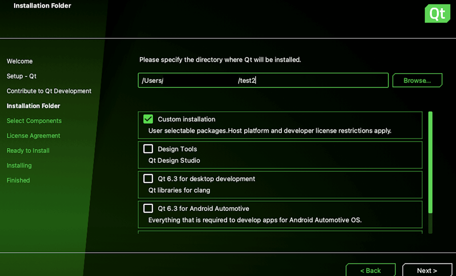 Maintenance tool allows you to modify your existing Qt installation. Navigate to Custom installation and select Next.