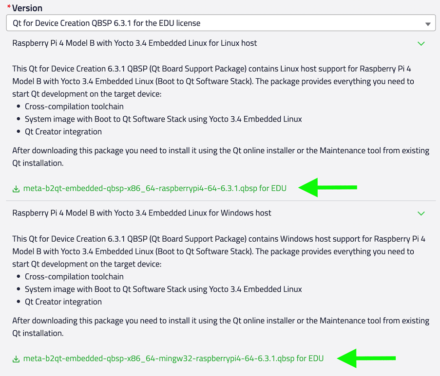 Log in to your Qt Account. Go to the Downloads section and select Qt for Device Creation QBSP for the EDU license from the drop-down menu in the Product field.