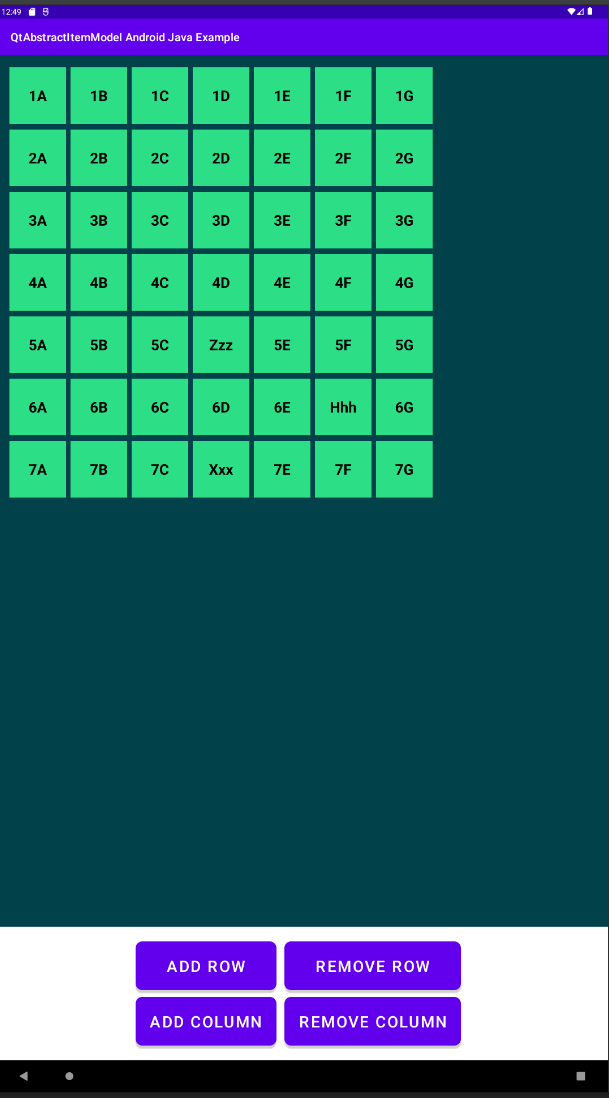 }The example implements methods on the model side for MainActivity UI interaction to add and remove rows and columns. Calls begin, end, insert, and remove rows to update model indexes, like beginInsertRow(). Because the example uses the QtAbstractItemModel, it must call beginInsertRows() and endInsertRows() every time it inserts new rows into the model. The same applies to removal. As the methods are called from the Android side, the execution takes place in the Android main thread context.