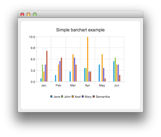 The QBarSeries class and the BarSeries QML type present data as vertical bars grouped by category. Similarly, the QHorizontalBarSeries class and the HorizontalBarSeries QML type present data as horizontal bars.