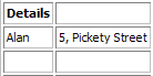 Original Table | Suppose we have a 2x3 table of names and addresses. To merge both columns in the first row we invoke mergeCells() with row = 0, column = 0, numRows = 1 and numColumns = 2.table->mergeCells(0, 0, 1, 2); |