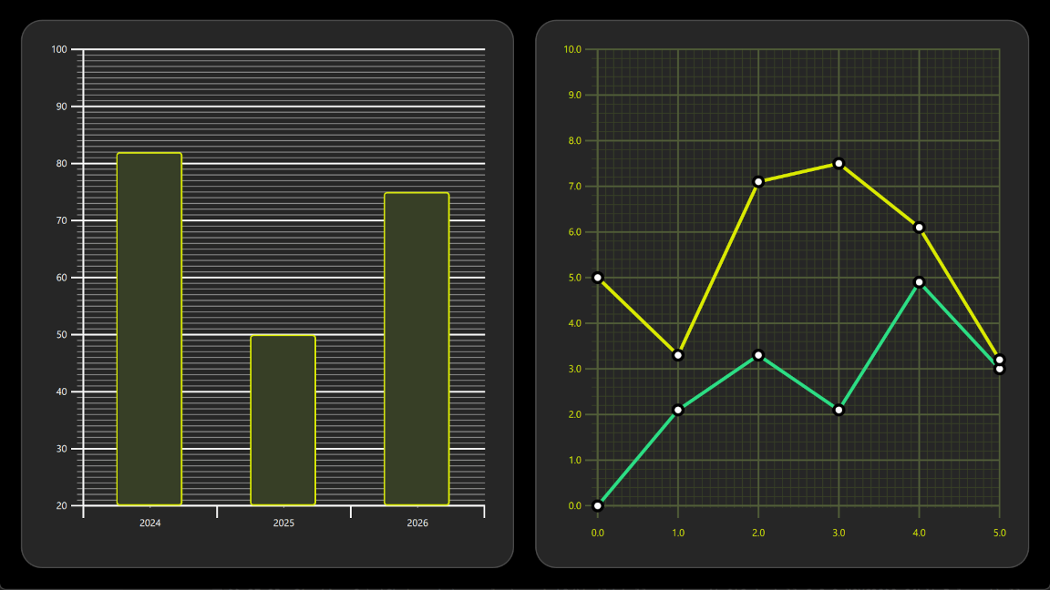 GraphsView { anchors.fill: parent anchors.margins: 16 axisX: BarCategoryAxis { categories: [2024, 2025, 2026] gridVisible: false subGridVisible: false } axisY: ValueAxis { min: 20 max: 100 tickInterval: 10 subTickCount: 9 } theme: GraphsTheme { colorScheme: GraphsTheme.ColorScheme.Dark theme: GraphsTheme.Theme.QtGreen } ...
