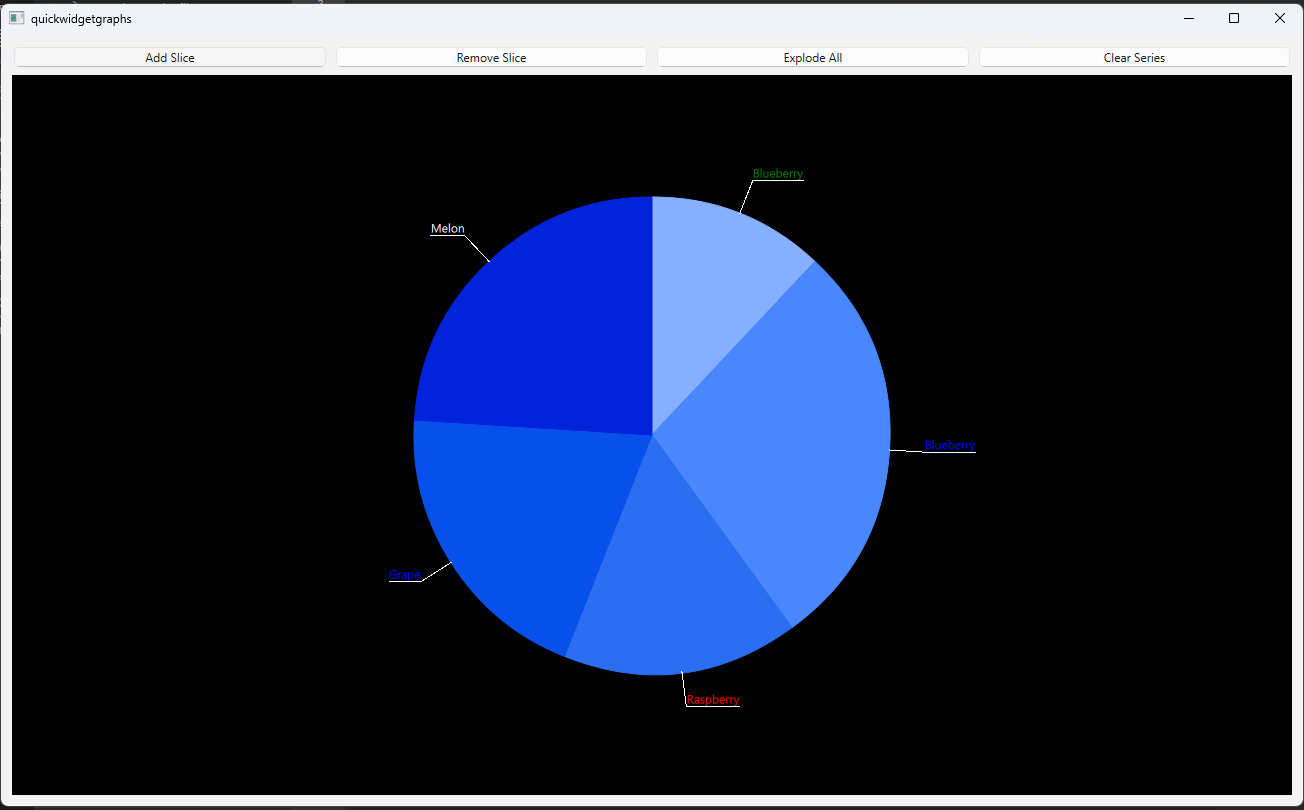 ... m_pieSeries = new QPieSeries; fillSliceInfo(); for (int i = 1; i < 5; ++i) { QPieSlice *slice = new QPieSlice; slice->setValue(m_sliceInfo.value.at(QRandomGenerator::global()->bounded(0, 6))); slice->setLabel(m_sliceInfo.label.at(QRandomGenerator::global()->bounded(0, 6))); slice->setLabelColor(m_sliceInfo.color.at(QRandomGenerator::global()->bounded(0, 6))); m_pieSeries->append(slice); } m_pieSeries->setLabelsVisible(true); ...