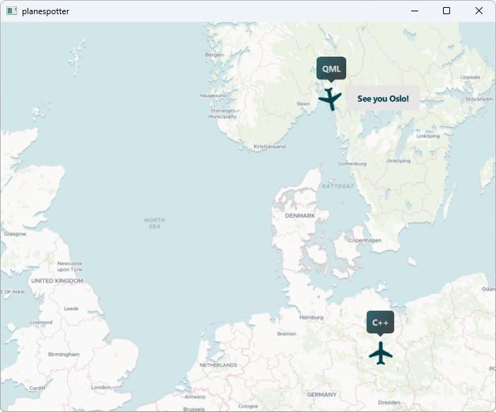 The example shows a map of Europe and airplanes on two routes across Europe. The first airplane commutes between Oslo and Berlin and the second airplane commutes between London and Berlin. The position tracking of each airplane is implemented in C++. The Oslo-Berlin plane is piloted in QML and the London-Berlin plane is commanded by a C++ pilot.