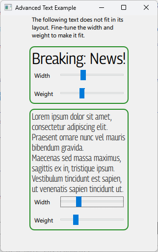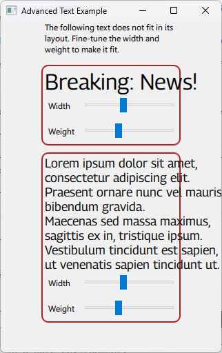 The example illustrates how this may be used in a real world scenario: When starting the example, the text snippets stretch outside the bounding boxes defined in the strict layout.