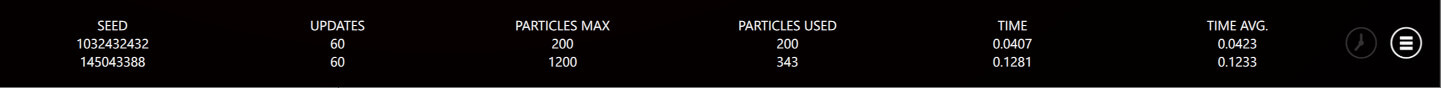 Bottom-right corner of each example contain an icon that opens the logging view. From this view, you can see different debug data about the particles. Each ParticleSystem3D has its own row showing its ParticleSystem3DLogging data.