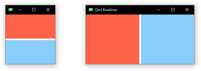 GridLayout { columns: width < 300 ? 1 : 2 anchors.fill: parent Rectangle { id: rectangle1 color: "tomato" Layout.fillHeight: true Layout.fillWidth: true } Rectangle { id: rectangle2 color: "lightskyblue" Layout.fillHeight: true Layout.fillWidth: true } }