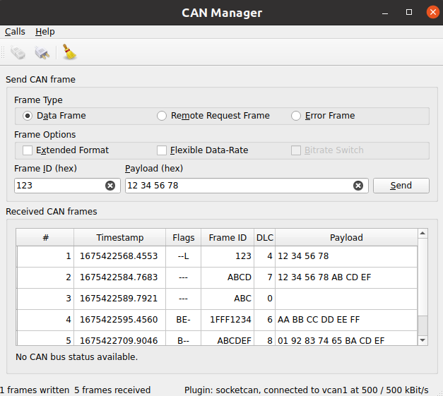 To send custom data over the CAN bus, the user needs to provide at least a frameId and a payload. Optionally other QCanBusFrame parameters can be configured:
