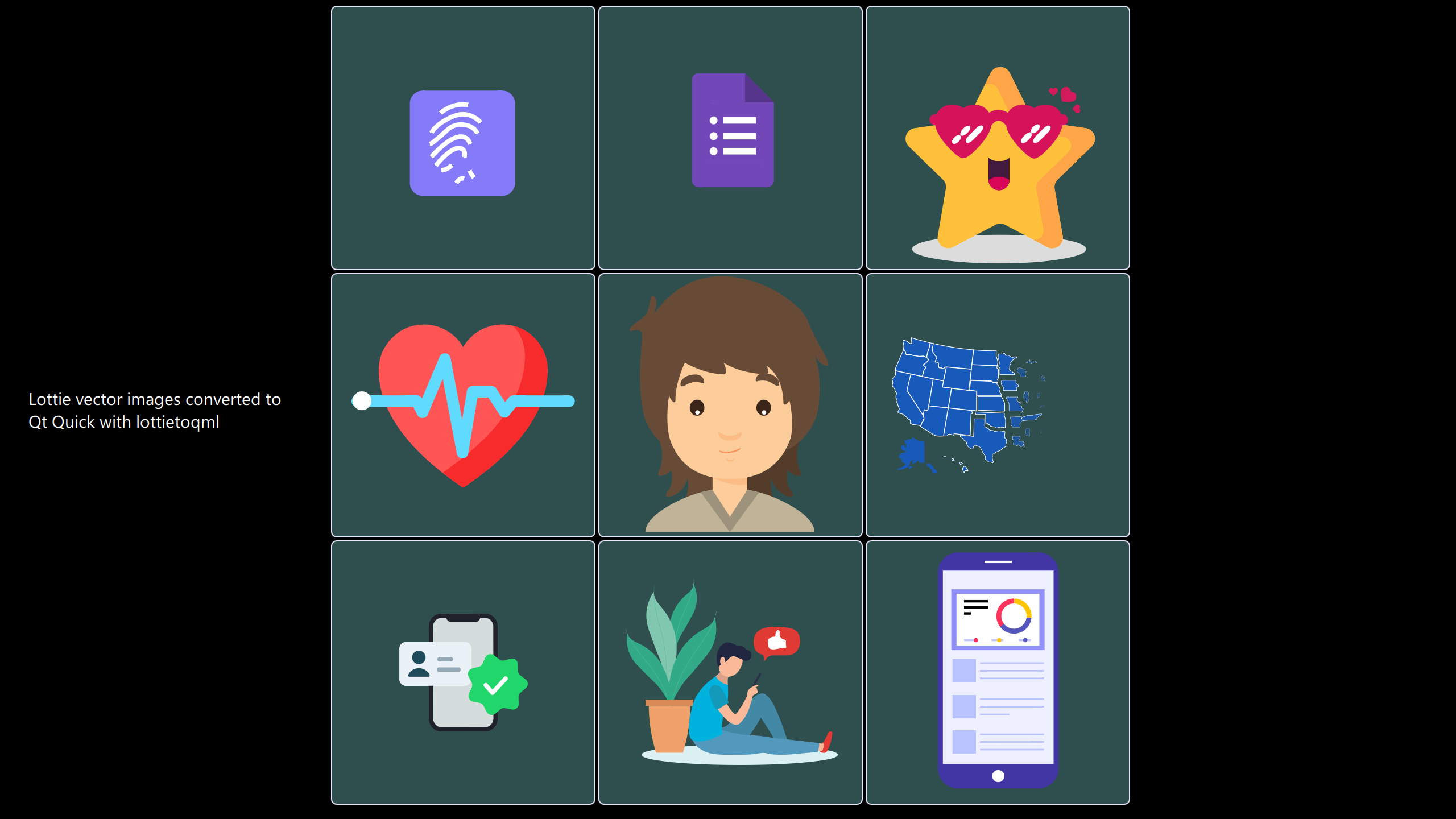 The lottietoqml Example shows how animated Lottie files can be converted to QML. As seen in this screenshot, multiple animated images are laid out in a grid. They can each be zoomed without scaling artifacts or loss of fidelity.