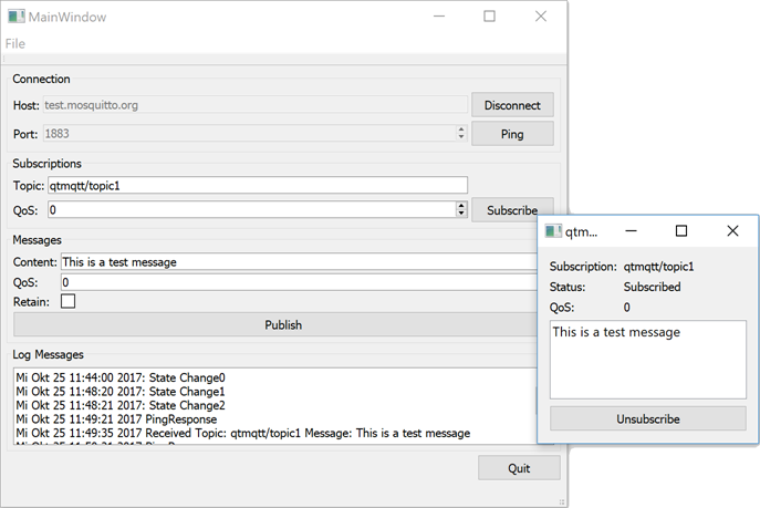 MQTT Subscriptions shows how to create an application that communicates with an MQTT broker. A new dialog opens for each subscription, where you can see the messages on the subscribed topics.