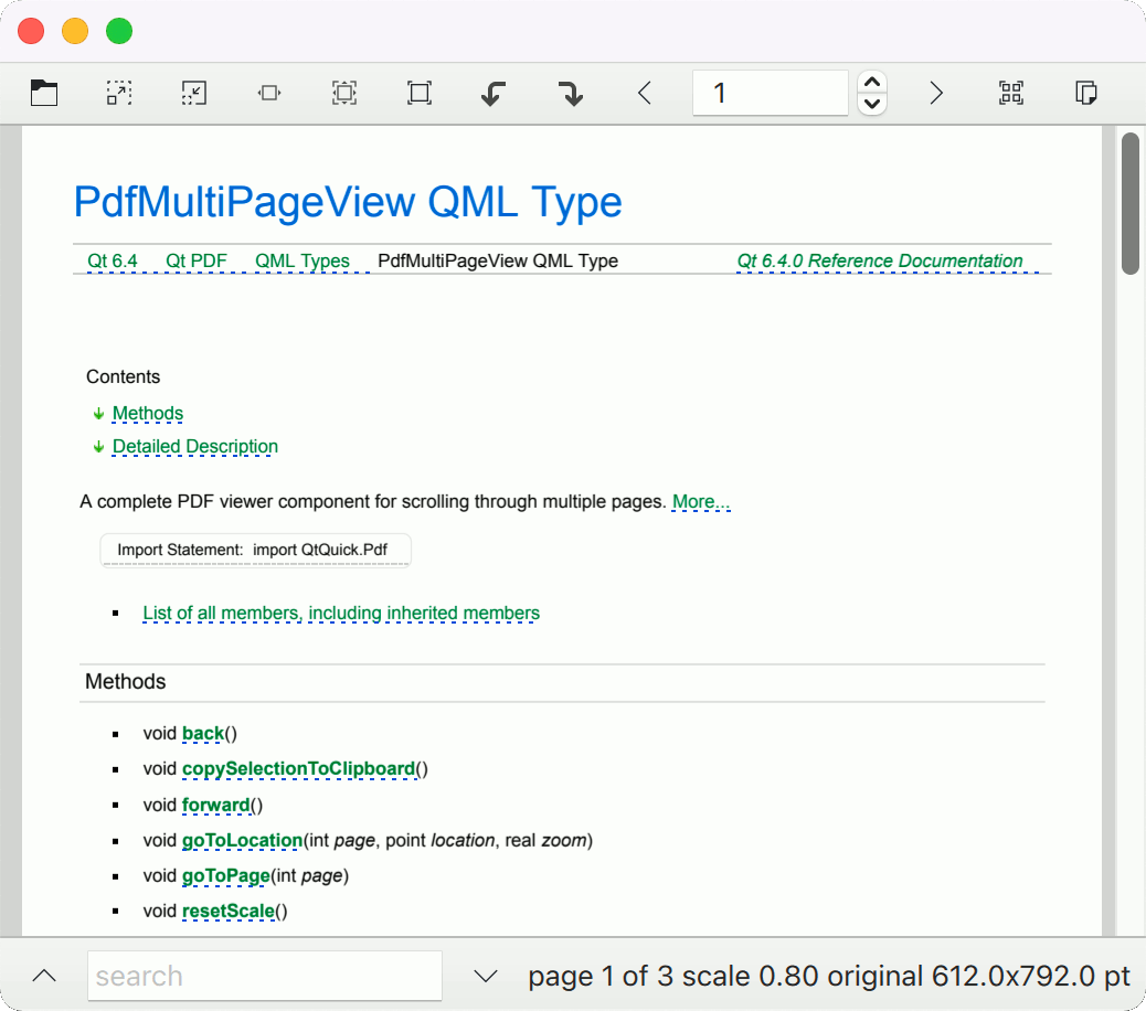 footer: ToolBar { height: footerRow.implicitHeight RowLayout { id: footerRow anchors.fill: parent ToolButton { action: Action { icon.source: "qrc:/pdfviewer/resources/go-up-search.svg" shortcut: StandardKey.FindPrevious onTriggered: view.searchBack() } ToolTip.visible: enabled && hovered ToolTip.delay: 2000 ToolTip.text: "find previous" } TextField { id: searchField placeholderText: "search" Layout.minimumWidth: 150 Layout.fillWidth: true onAccepted: searchDrawer.open() Image { visible: searchField.text !== "" source: "qrc:/pdfviewer/resources/edit-clear.svg" anchors { right: parent.right top: parent.top bottom: parent.bottom margins: 3 rightMargin: 5 } TapHandler { onTapped: searchField.clear() } } } ToolButton { action: Action { icon.source: "qrc:/pdfviewer/resources/go-down-search.svg" shortcut: StandardKey.FindNext onTriggered: view.searchForward() } ToolTip.visible: enabled && hovered ToolTip.delay: 2000 ToolTip.text: "find next" } Label { id: statusLabel property size implicitPointSize: document.pagePointSize(view.currentPage) text: "page " + (currentPageSB.value) + " of " + document.pageCount + " scale " + view.renderScale.toFixed(2) + " original " + implicitPointSize.width.toFixed(1) + "x" + implicitPointSize.height.toFixed(1) + " pt" visible: document.pageCount > 0 } } } }