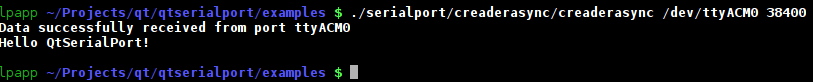 Command Line Reader Async shows how to use the QSerialPort class for receiving data asynchronously over the selected serial port with the desired settings.