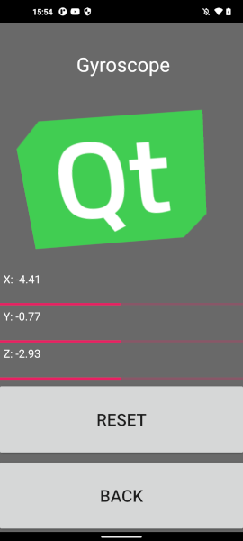 Accelerometer { id: accelerometer active: true dataRate: 25 property real x: 0 property real y: 0 property real z: 0 onReadingChanged: { x = reading.x y = reading.y z = reading.z imageTranslation.x = -reading.x * 10 imageTranslation.y = reading.y * 10 } }