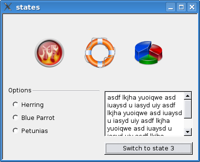 int main(int argc, char *argv[]) { Q_INIT_RESOURCE(states); QApplication app(argc, argv); // Text edit and button QTextEdit *edit = new QTextEdit; edit->setText("asdf lkjha yuoiqwe asd iuaysd u iasyd uiy " "asdf lkjha yuoiqwe asd iuaysd u iasyd uiy " "asdf lkjha yuoiqwe asd iuaysd u iasyd uiy " "asdf lkjha yuoiqwe asd iuaysd u iasyd uiy!"); QPushButton *button = new QPushButton; QGraphicsProxyWidget *buttonProxy = new QGraphicsProxyWidget; buttonProxy->setWidget(button); QGraphicsProxyWidget *editProxy = new QGraphicsProxyWidget; editProxy->setWidget(edit); QGroupBox *box = new QGroupBox; box->setFlat(true); box->setTitle("Options"); QVBoxLayout *layout2 = new QVBoxLayout; box->setLayout(layout2); layout2->addWidget(new QRadioButton("Herring")); layout2->addWidget(new QRadioButton("Blue Parrot")); layout2->addWidget(new QRadioButton("Petunias")); layout2->addStretch(); QGraphicsProxyWidget *boxProxy = new QGraphicsProxyWidget; boxProxy->setWidget(box); // Parent widget QGraphicsWidget *widget = new QGraphicsWidget; QGraphicsLinearLayout *layout = new QGraphicsLinearLayout(Qt::Vertical, widget); layout->addItem(editProxy); layout->addItem(buttonProxy); widget->setLayout(layout); Pixmap *p1 = new Pixmap(QPixmap(":/digikam.png")); Pixmap *p2 = new Pixmap(QPixmap(":/akregator.png")); Pixmap *p3 = new Pixmap(QPixmap(":/accessories-dictionary.png")); Pixmap *p4 = new Pixmap(QPixmap(":/k3b.png")); Pixmap *p5 = new Pixmap(QPixmap(":/help-browser.png")); Pixmap *p6 = new Pixmap(QPixmap(":/kchart.png")); QGraphicsScene scene(0, 0, 400, 300); scene.setBackgroundBrush(scene.palette().window()); scene.addItem(widget); scene.addItem(boxProxy); scene.addItem(p1); scene.addItem(p2); scene.addItem(p3); scene.addItem(p4); scene.addItem(p5); scene.addItem(p6);