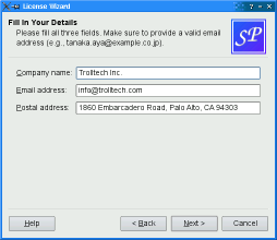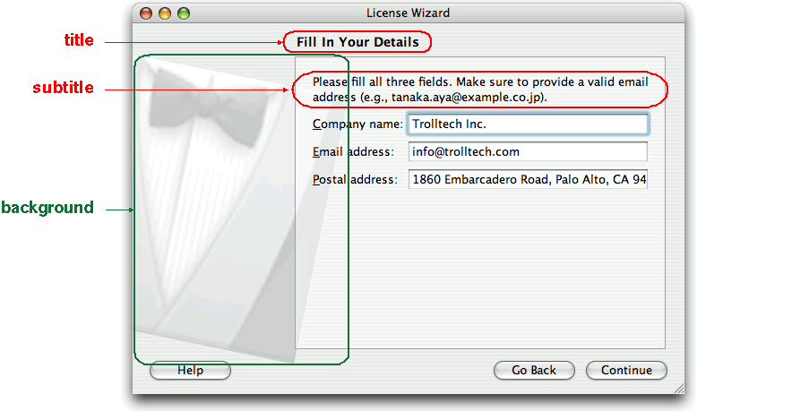 When a subTitle is set, QWizard displays it in a header, in which case it also uses the BannerPixmap and the LogoPixmap to decorate the header. The WatermarkPixmap is displayed on the left side, below the header. At the bottom, there is a row of buttons allowing the user to navigate through the pages.