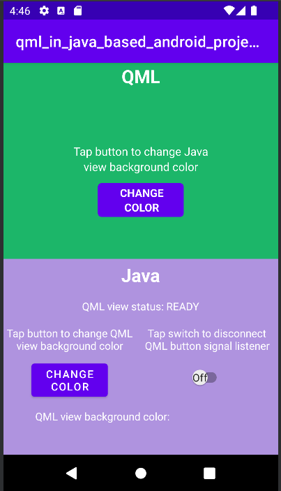 m_mainQmlContent.getColorStringProperty() 方法用于获取 m_mainQmlContent 根对象的当前背景颜色,然后在应用程序的 Java/Kotlin Android 端向用户显示。
