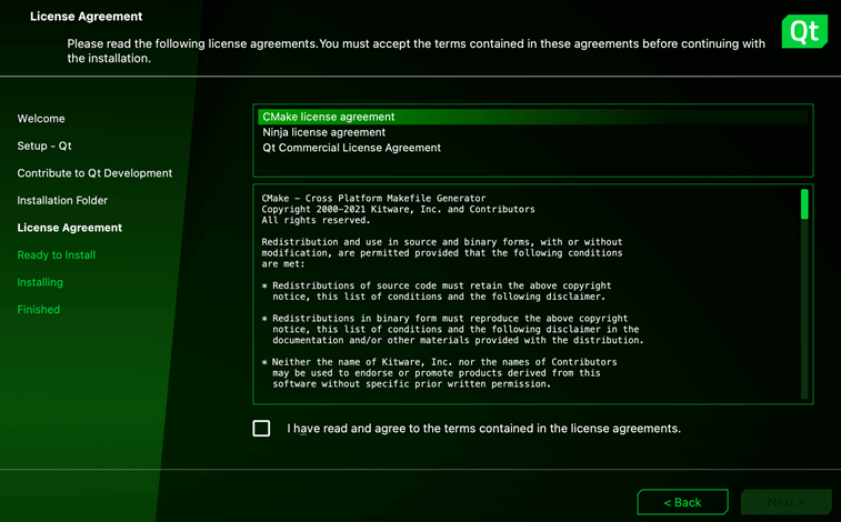 在继续之前,您需要接受许可协议。请注意,教育许可证仅用于学习目的,详见 Qt 许可证协议附录 5。