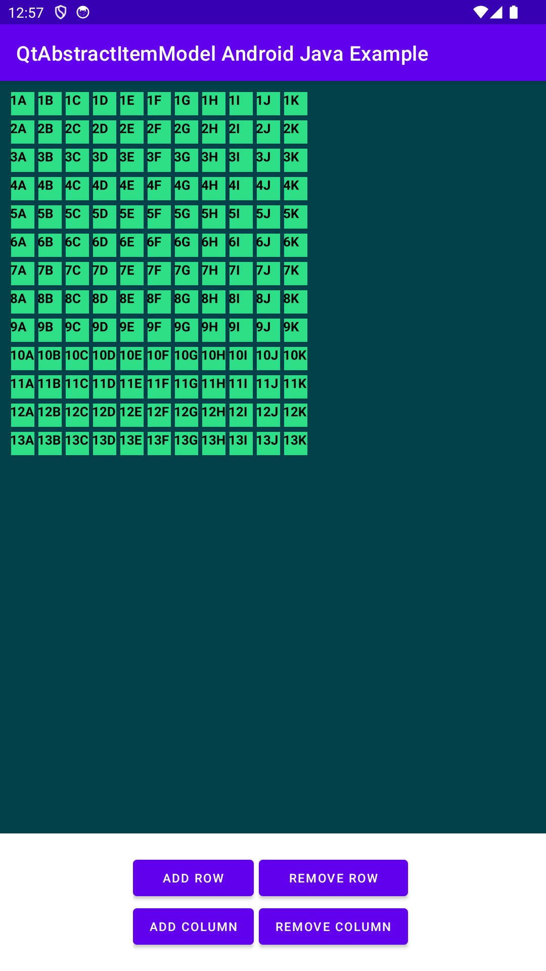 }该示例在模型侧实现了用于MainActivity UI 交互的方法,以添加和删除行和列。调用 begin、end、insert 和 remove 行来更新模型索引,如 beginInsertRow()。由于示例使用了QtAbstractItemModel ,因此每次向模型插入新行时都必须调用 beginInsertRows() 和 endInsertRows()。删除也是如此。由于这些方法是从 Android 端调用的,因此在 Android 主线程上下文中执行。