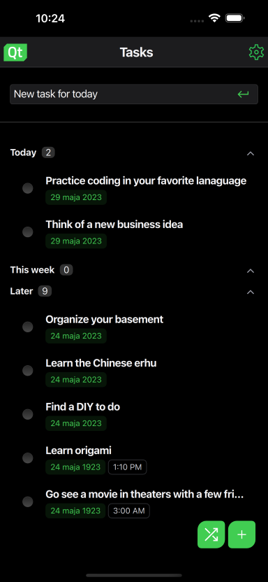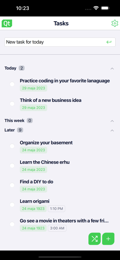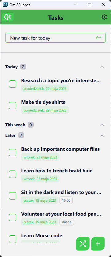 To Do List演示了一个待办事项列表应用程序示例,该应用程序在任何平台上看起来都是原生的。该示例可在 QtDesignStudio 和 QtCreator 中运行和编辑。它展示了如何创建和使用自定义样式,以及如何使用设置来控制应用程序的外观和行为。它还介绍了如何在委托上实现简单的拖放行为。该应用程序使用本地存储来存储设备上的项目,并使用XMLHttpRequest 从公共 API(随机任务功能)中检索数据。视图由StackView 组件控制。
