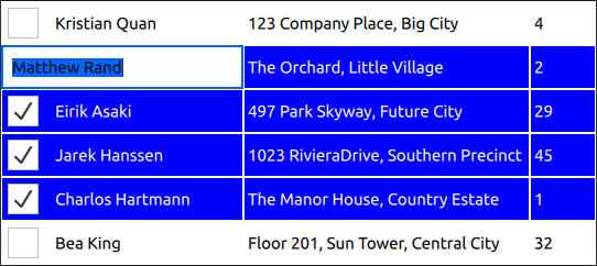 delegate: TableViewDelegate { id: tableCell checked: column === 0 ? checkBox.checked : tableView.itemAtIndex(tableView.index(row, 0)).checked selected: checked background: Item { Rectangle { anchors.fill: parent anchors.margins: tableCell.current ? 3 : 1 color: tableCell.selected ? "blue" : "white" } Rectangle { anchors.fill: parent color: "transparent" border.color: "darkblue" border.width: tableCell.current ? 2 : 0 } } contentItem: Item { implicitHeight: 40 visible: !tableCell.editing RowLayout { anchors.fill: parent CheckBox { id: checkBox implicitWidth: height Layout.fillHeight: true checked: false visible: tableCell.column === 0 } Text { Layout.leftMargin: 4 Layout.fillWidth: true Layout.fillHeight: true verticalAlignment: Text.AlignVCenter color: tableCell.selected ? "white" : "black" text: tableCell.model.display } } } TableView.editDelegate: FocusScope { width: parent.width height: parent.height TableView.onCommit: { let qaim = tableCell.tableView.model if (!qaim) return const index = qaim.index(tableCell.row, tableCell.column) // instead of the edit role, any custom role supported by the model can be checked // e.g. if (!tableCell.checked || !tableCell.model.customRole) if (!tableCell.checked || !tableCell.model.edit) return // instead of the edit role, any custom role supported by the model can be set // e.g. tableCell.model.customRole = textField.text tableCell.model.edit = textField.text tableCell.model.display = textField.text } Component.onCompleted: textField.selectAll() TextField { id: textField anchors.fill: parent text: tableCell.model.edit ?? tableCell.model.display ?? "" focus: true } } }