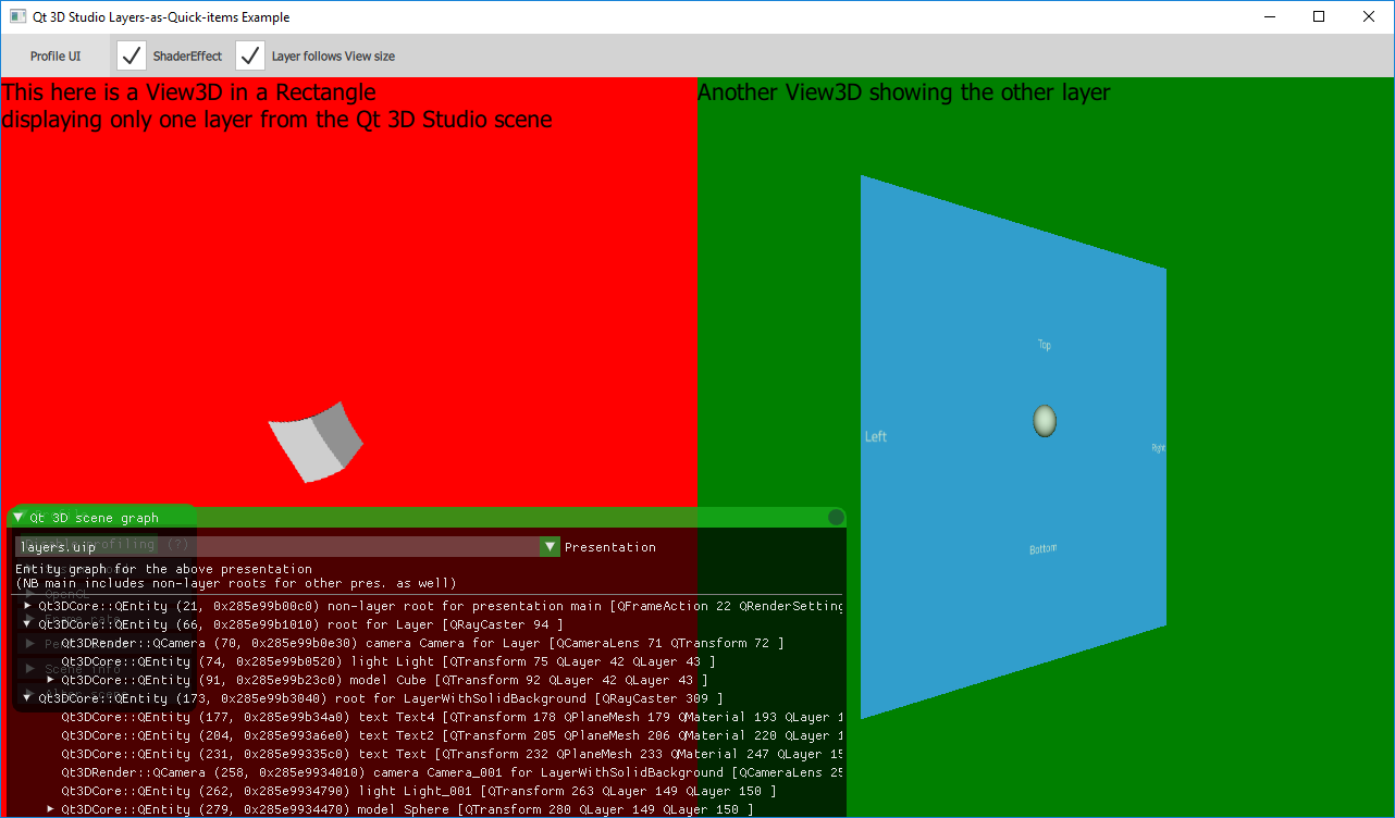 In the example the source .uip file has two layers. Both have transparent backgrounds, one contains a single cube, while the other a sphere and some text nodes. When it comes to the Studio3D item, the QML code is no different from other examples. What makes it special is the inclusion of two View3D items, each referencing a layer from the .uip presentation by name.