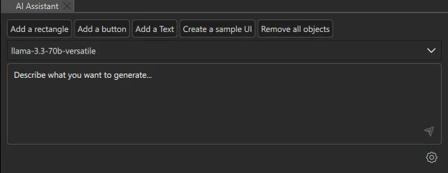 3D Assets AI Assistant view The AI Assistant view lets you use a LLM to protoype user interfaces. See also AI assistant. 3D Assets Available under certain Qt licenses.Find out more.