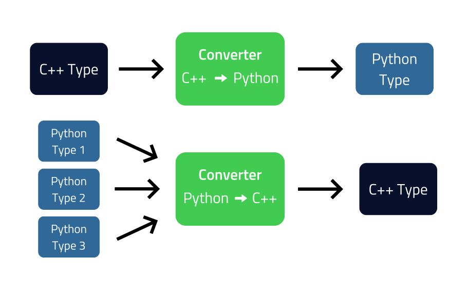 In the process of creating Python bindings of a C++ library, most of the C++ classes will have wrappers representing them in Python land. But there may be other classes that are very simple and/or have a Python type as a direct counter part. (Example: a “Complex” class, that represents complex numbers, has a Python equivalent in the “complex” type.) Such classes, instead of getting a Python wrapper, normally have conversions rules, from Python to C++ and vice-versa.