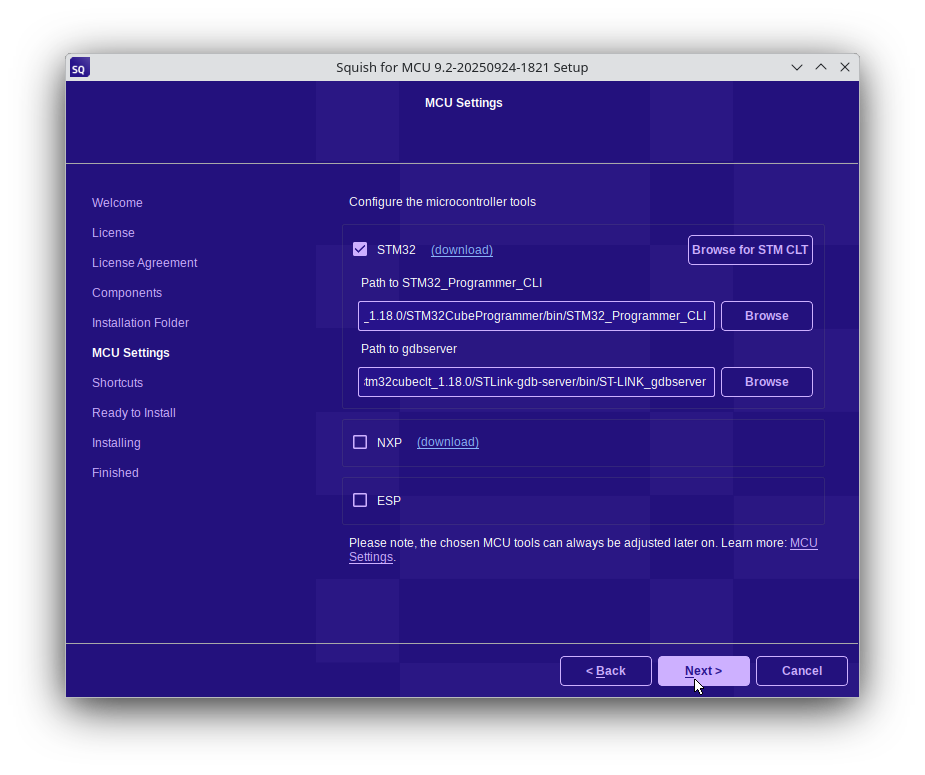 When you reach this screen, you can download and configure the location of MCU tools and drivers. The tools currently supported are for NXP and STM32 devices.